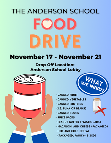 - Anderson Food Drive – Mon-Fri, 11/17-21, School lobby